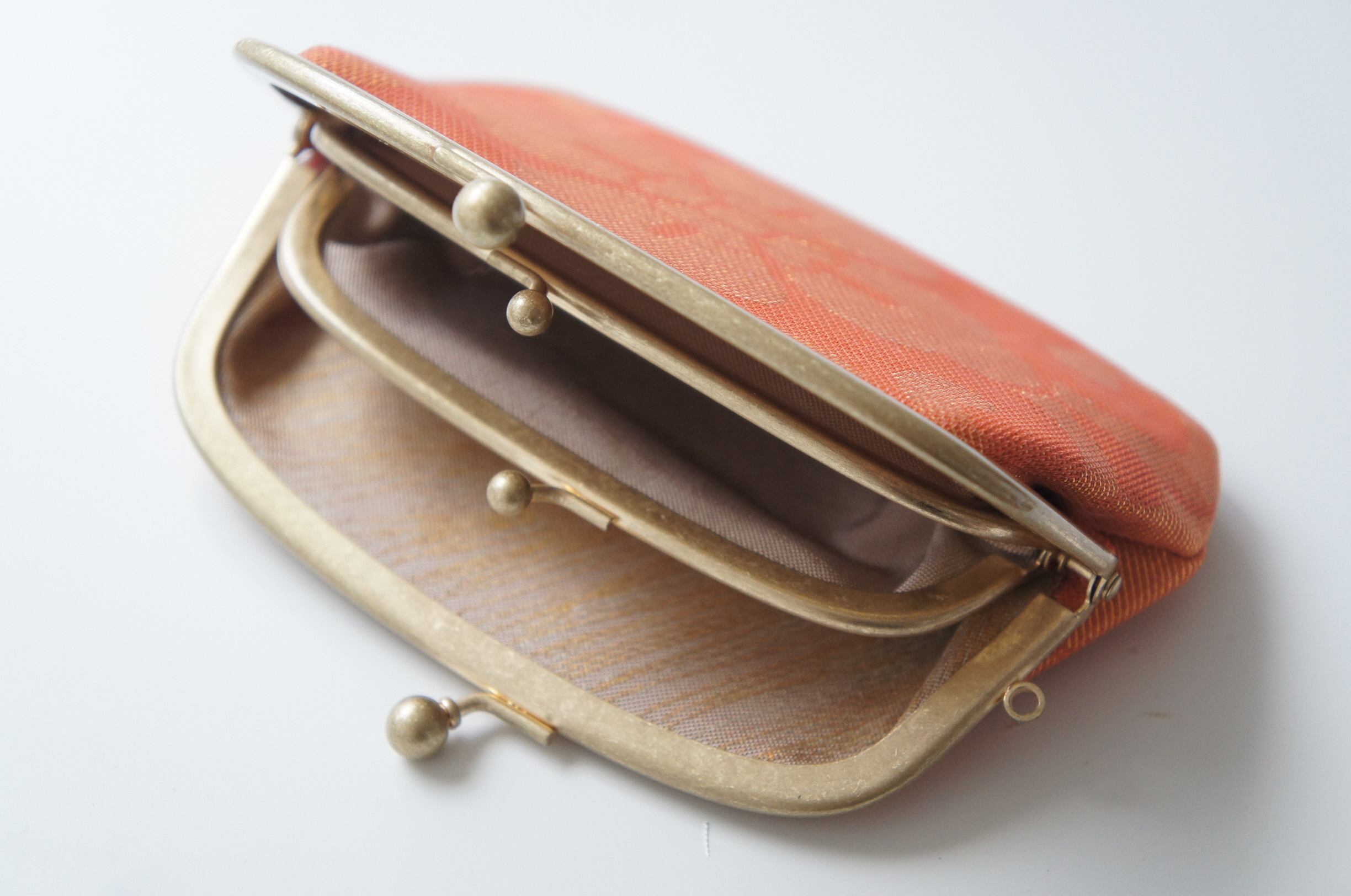 This was a bespoke order from an individual to make a double clasp framed purse (gamaguchi) using a beautiful summer obi with gold leaf, a memento of her late mother. Obi silk with a silk-screened pine needle motif is used for the lining.